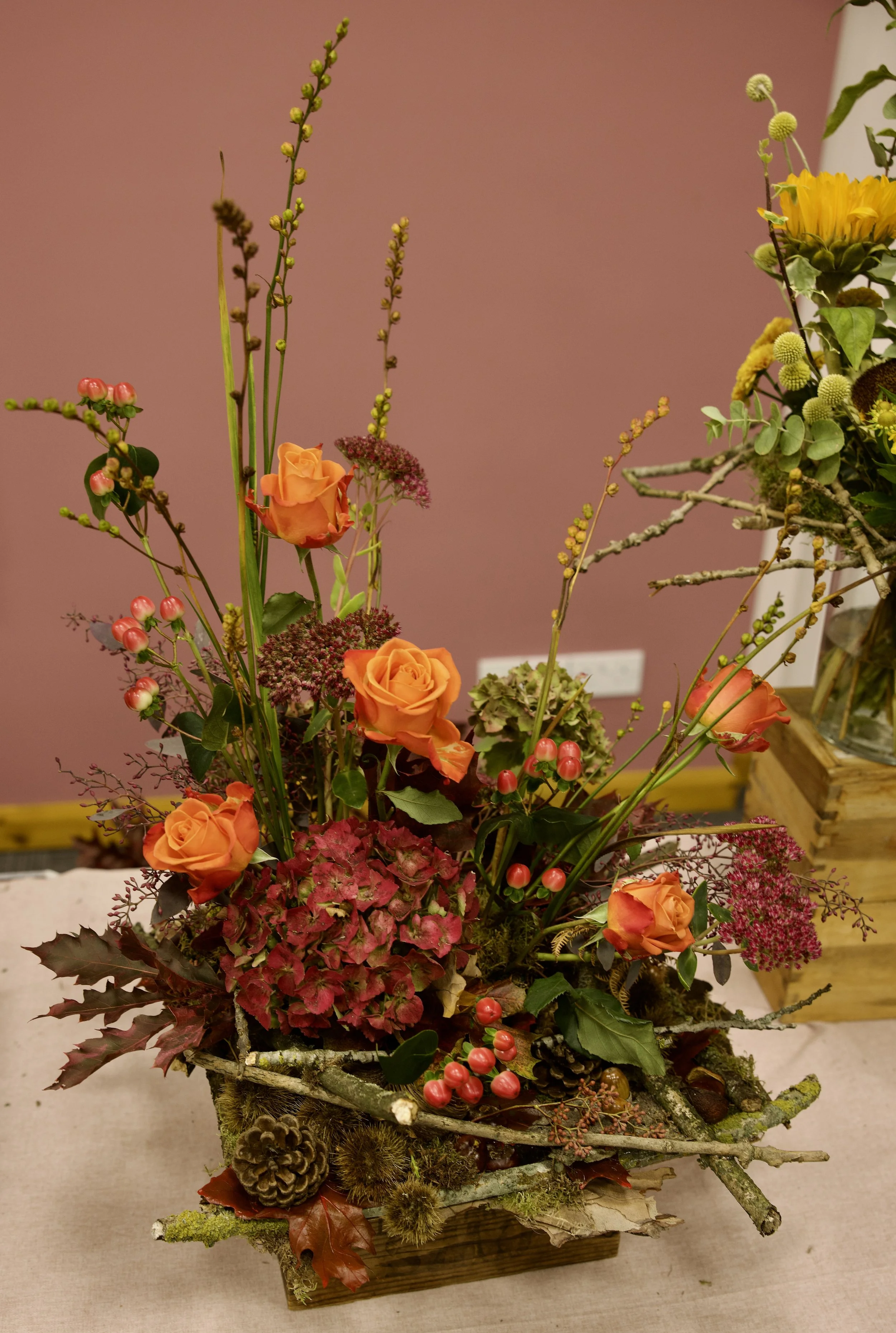 Ashfield Floral Art Club - a wild style, flowers placed in groups, twigs, berries and pods used too.