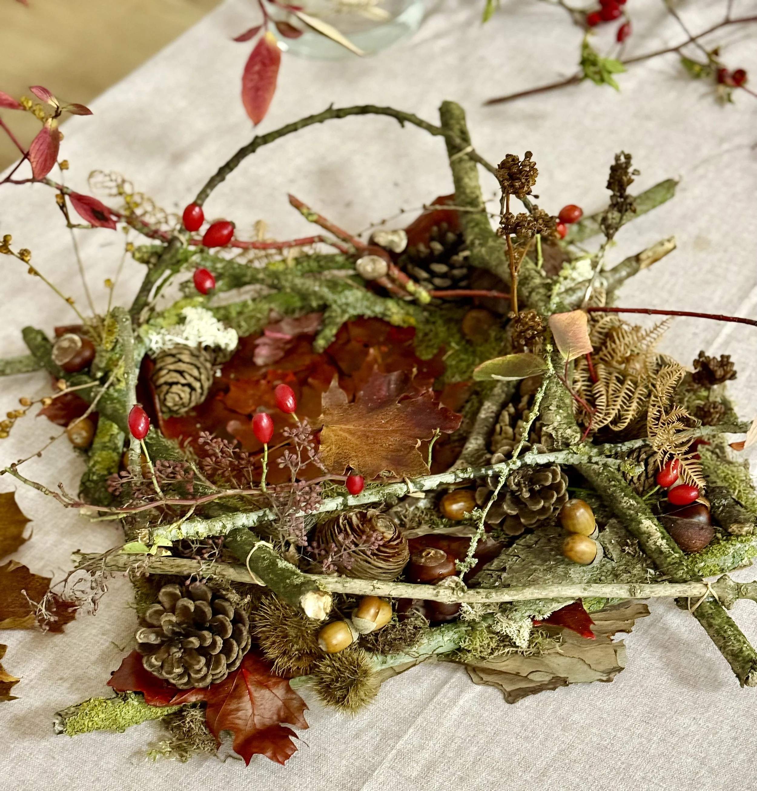 Using a metal ring covered in hessian & then conkers, acorns, and poppy heads were glued to the ring.